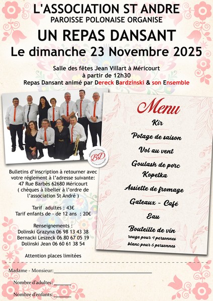 REPAS DANSANT DE L’ASSOCIATION SAINT-ANDRÉ animé par DERECK BARDZINSKI et son Ensemble