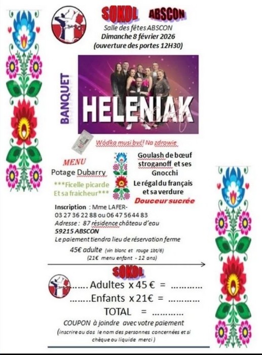 Prix : 45 € (21 € : menu enfant -12 ans) Réservations : 03 27 36 22 88 ou 06 47 56 44 83 |
