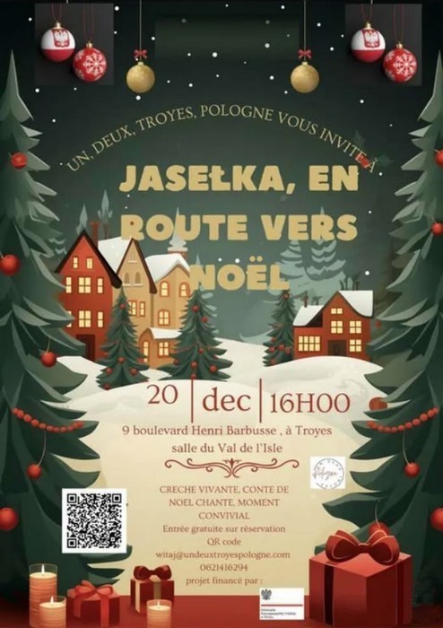 TROYES (10) - Salle du Val de l‘Isle – 9 boulevard Henri Barbusse – 16 h “UN, DEUX, TROYES, POLOGNE” VOUS INVITE À “JASEŁKA, EN ROUTE VERS NOËL” Crèche vivante – Conte de Noël – Chante – Moment convivial Entrée gratuite sur réservation Infos : 06 21 41 62 94 |
