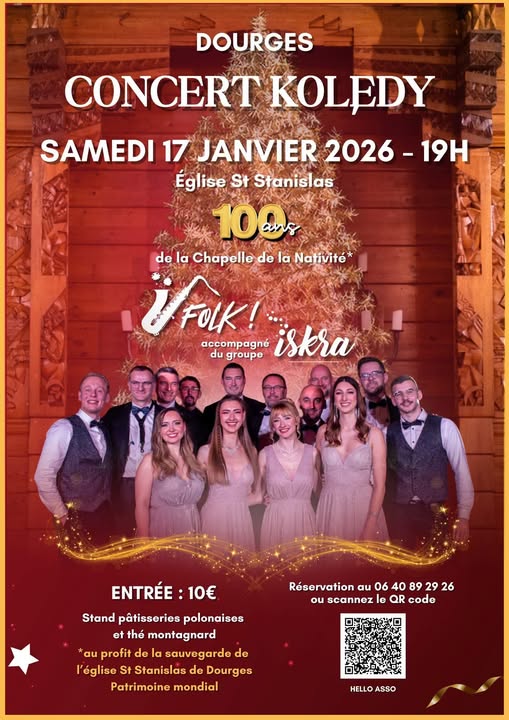 CONCERT KOLĘDY AVEC FOLK ET ISKRA Un événement à l'occasion des 100 ans de la Chapelle de la Nativité, patrimoine mondial, œuvre de Jan Szczepkowski, Grand Prix de l'Exposition Internationale des Arts Décoratifs de Paris (1925) Au profit de la Sauvegarde de l'Église St Stanislas de Dourges Entrée : 10 € - enfants moins de 12 ans : 5€ stands de pâtisseries polonaises et herbata góralska Réservations : QR code Hello Asso ou au 06 40 89 29 26 |