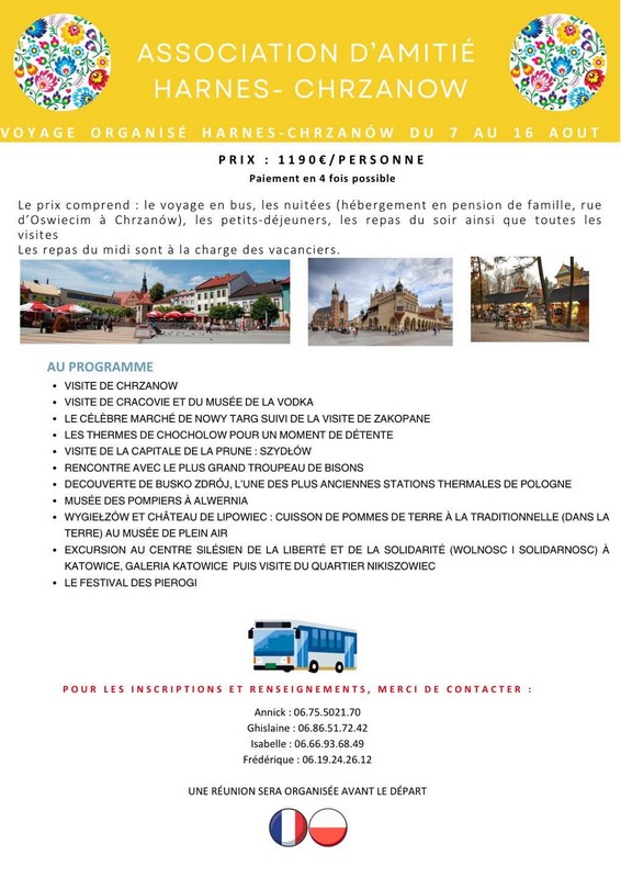Voyage en autocar en Pologne organisé par l’association d’amitié Harnes-Chrzanów 7 – 16 août Nombreuses excursions : Chrzanów, Cracovie, Nowy Targ, Chochołów, Szydłów, Busko Zdrój, Alwernia, Wygiełzów, Katowice,… Prix : 1190 € Infos : 06 75 50 21 70 / 06 86 51 72 42 / 06 66 93 68 49 / 06 19 24 26 12 |