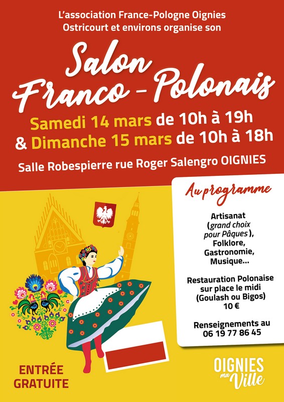 OIGNIES (62) – Salle Robespierre – Rue Roger Salengro Samedi (10 h – 19 h) / Dimanche (10 h – 18 h) SALON FRANCO-POLONAIS organisé par l’association France-Pologne Oignies-Ostricourt et environs