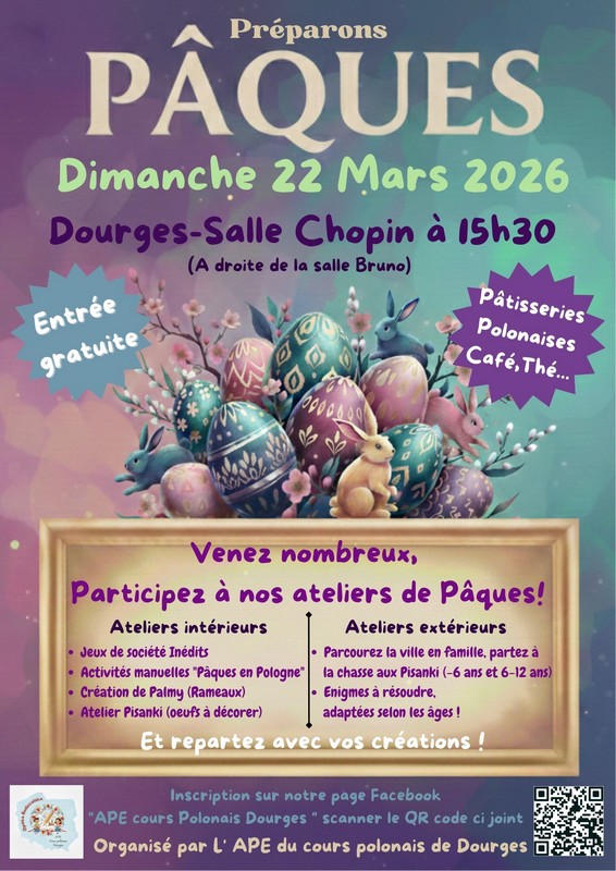 Venez nombreux participer aux Ateliers de Pâques organisés par l’APE du cours polonais dourgeois ! Jeux de sociétés inédits / Activités manuelles / Création de palmy/ Atelier pisanki Entrée gratuite Pâtisseries polonaises, café, thé… Inscriptions sur la page Facebook APE cours Polonais Dourges Scanner le QR code