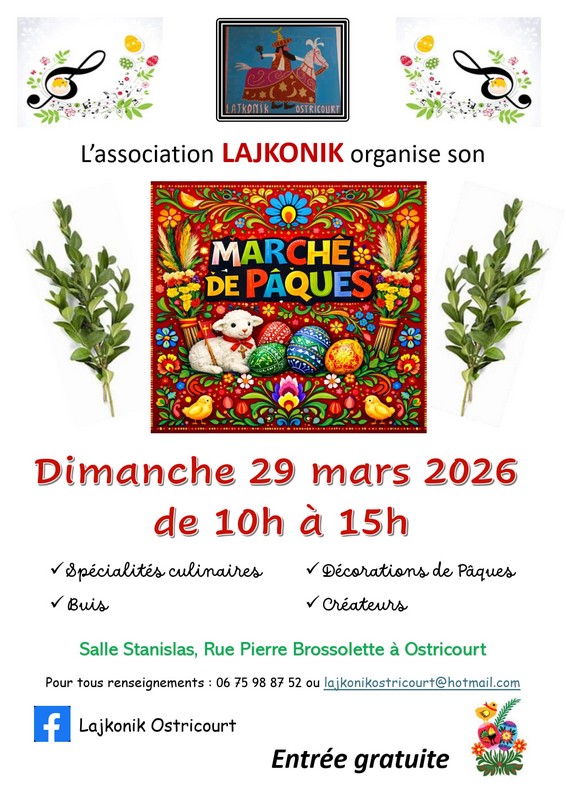 OSTRICOURT (59) – Salle Stanislas – Rue Pierre Brossolette – 10 h / 15 h MARCHÉ DE PÂQUES Décorations de Pâques Entrée gratuite Renseignements : 06 75 98 87 52 ou lajkonikostricourt@hotmail.com |
