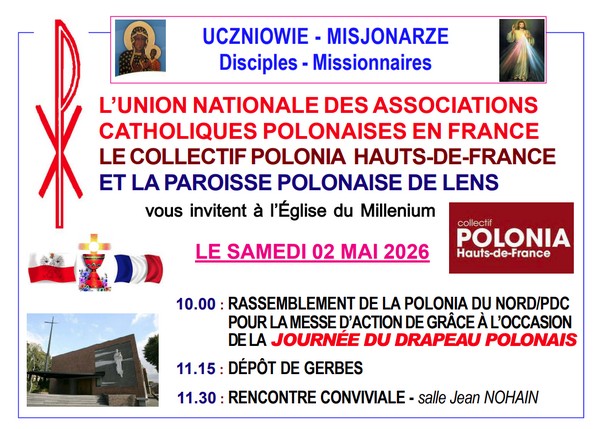 LENS (62) – Église du Millenium – 21 route de Béthune – 10 h Messe d’action de grâce à l’occasion de la Fête du Drapeau national polonais et de la Journée de la Polonia et des Polonais à l’étranger 11.15 : dépôt de gerbes au monument Solidarność 11.30 : rencontre conviviale salle Jean Nohain |