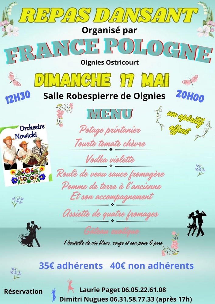 REPAS DANSANT organisé par L’ASSOCIATION FRANCE-POLOGNE animé par L’ORCHESTRE NOWICKI Prix : 35 € (adhérents) / 40 € (non adhérents) Réservation : 06 05 22 61 08 ou 06 31 58 77 33 |