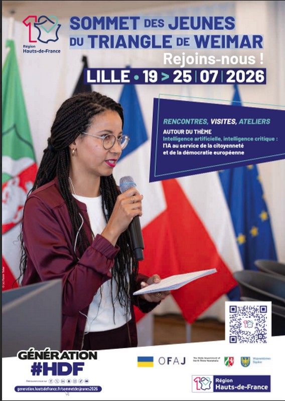 L’édition 2026 du Sommet des Jeunes se déroulera du dimanche 19 au samedi 25 juillet 2026 en Hauts-de-France sur le thème « Intelligence artificielle, intelligence critique : l’IA au service de la citoyenneté et de la démocratie européenne ». La participation est ouverte à tous les jeunes des Hauts-de-France, âgés de 17 à 23 ans résidant en Hauts-de-France (avoir obligatoirement 17 ans au 19/07 soit à la date du début du Sommet des Jeunes) : lycéens, étudiants, jeunes en formation, en apprentissage ou en recherche d’emploi. Nous sélectionnerons 13 jeunes des HDF âgés de 17 ans à 23 ans, autre critère requis : avoir un niveau correct en anglais pour pouvoir communiquer avec les jeunes des régions partenaires qui sont polonais, allemands et ukrainiens. La date limite de candidature a été prolongée au vendredi 8 mai en raison des vacances scolaires. Dossier de candidature : https://generation.hautsdefrance.fr/sommetdesjeunes2026/ |