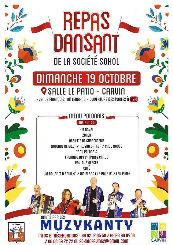 CARVIN (62) – Salle Le Patio – Avenue François Mitterrand – Ouverture des portes : 12 h REPAS DANSANT du 103e anniversaire de la société SOKOL Animé par les MUZYKANTY Menu polonais Tarif : 40 € Ambiance assurée ! Infos et réservations : 06 62 17 65 58 / 06 03 09 04 18 / 06 68 50 72 72 ou sokolcarvin62@gmail.com |
