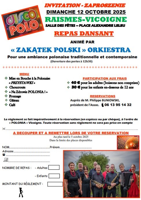 RAISMES-VICOIGNE (59) –Salle des fêtes – Place Alexandre Leleu – Ouverture des portes : 12 h 30 L’ASSOCIATION « POLONIA VICOIGNE » vous invite à son REPAS DANSANT animé par « ZAKĄTEK POLSKI ORKIESTRA » Ambiance polonaise traditionnelle et contemporaine PAF : 40 € pour les adultes (boissons non comprises) / 30 € pour les enfants en-dessous de 12 ans Réservations auprès de M. Philippe BUNIOWSKI, président de l’association : 06 13 95 14 32
